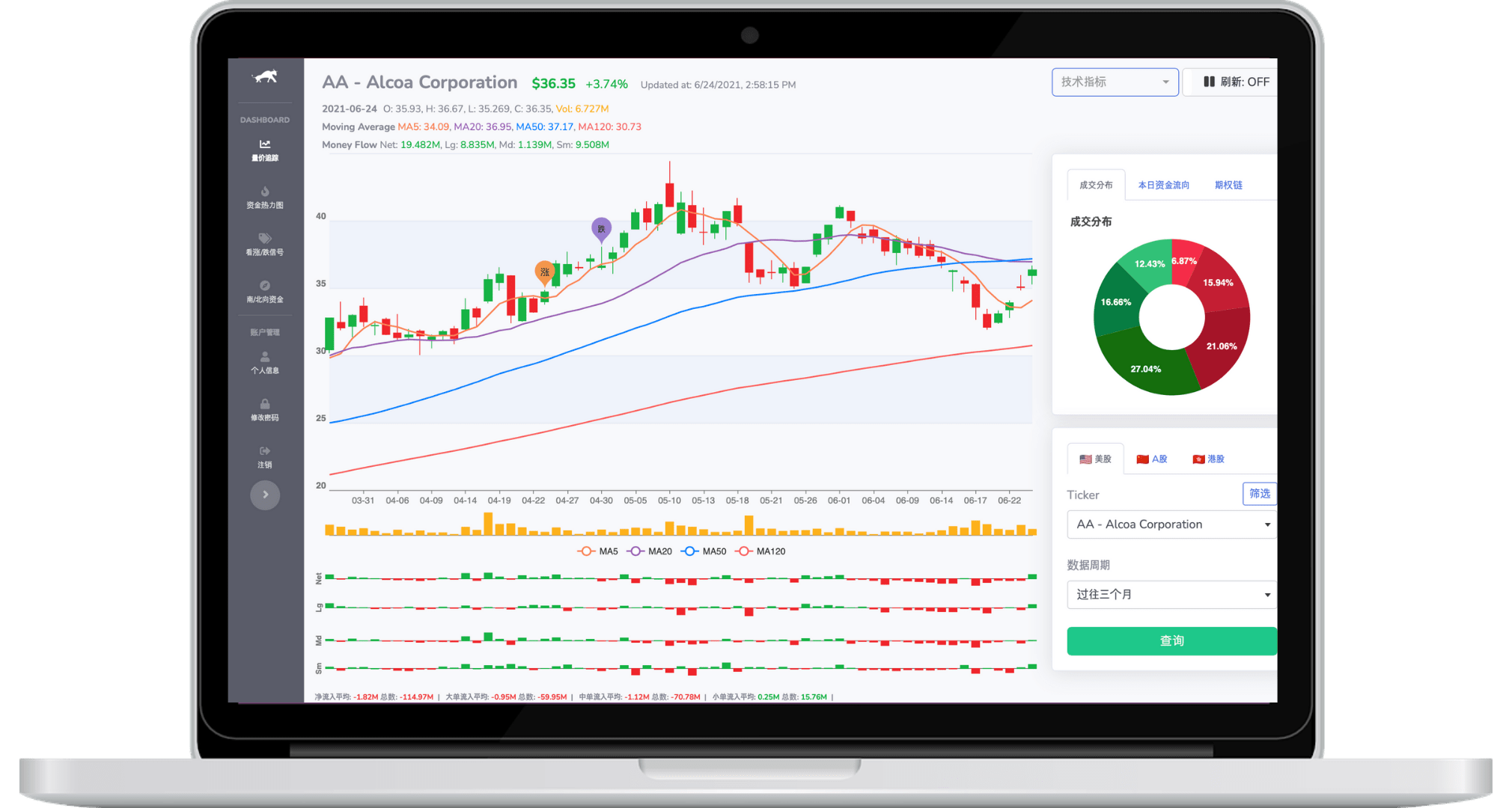 通过算法识别阻力支撑点位,同时观察个股的资金流入流出,均线走势等因素判断看涨及看跌信号